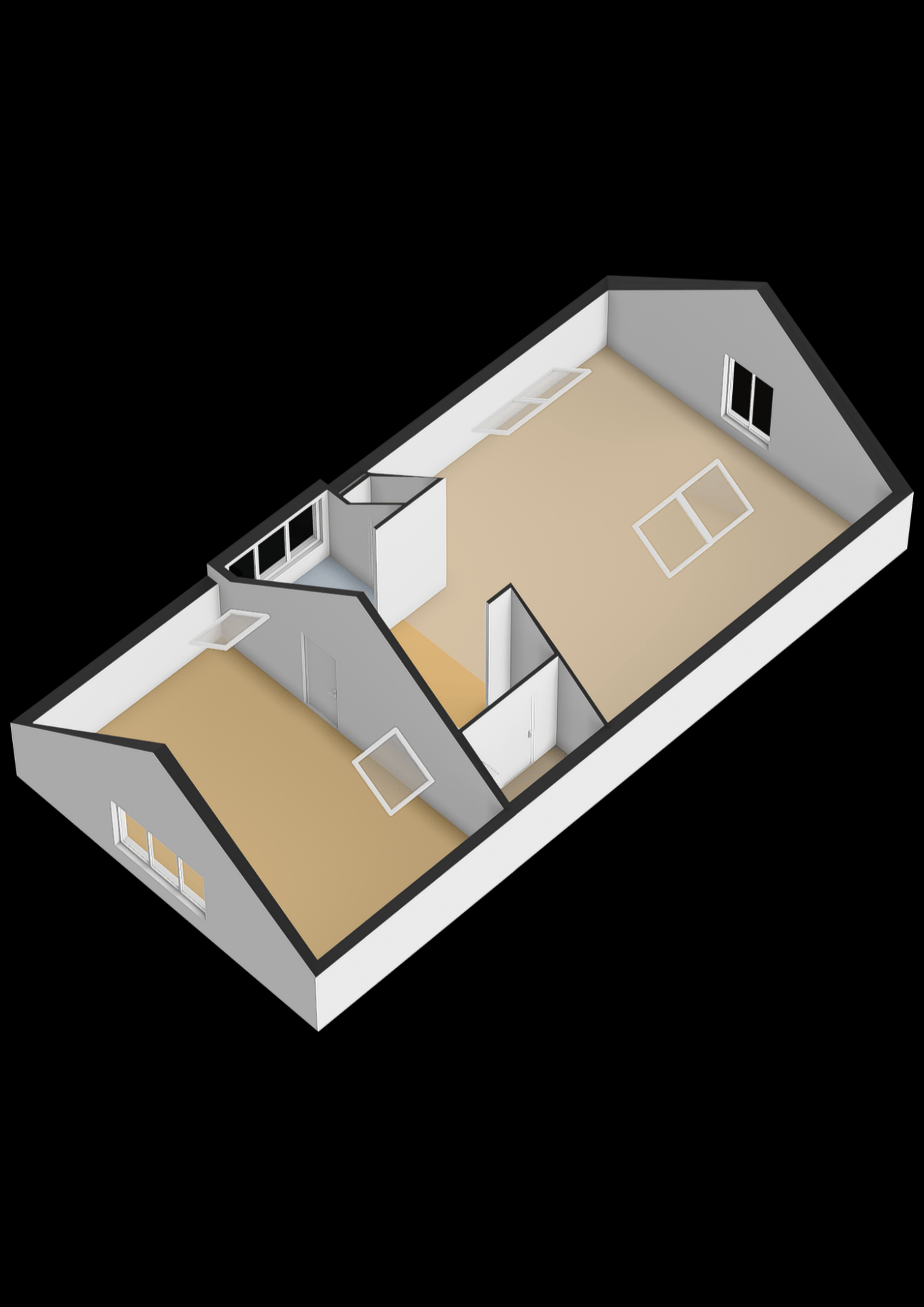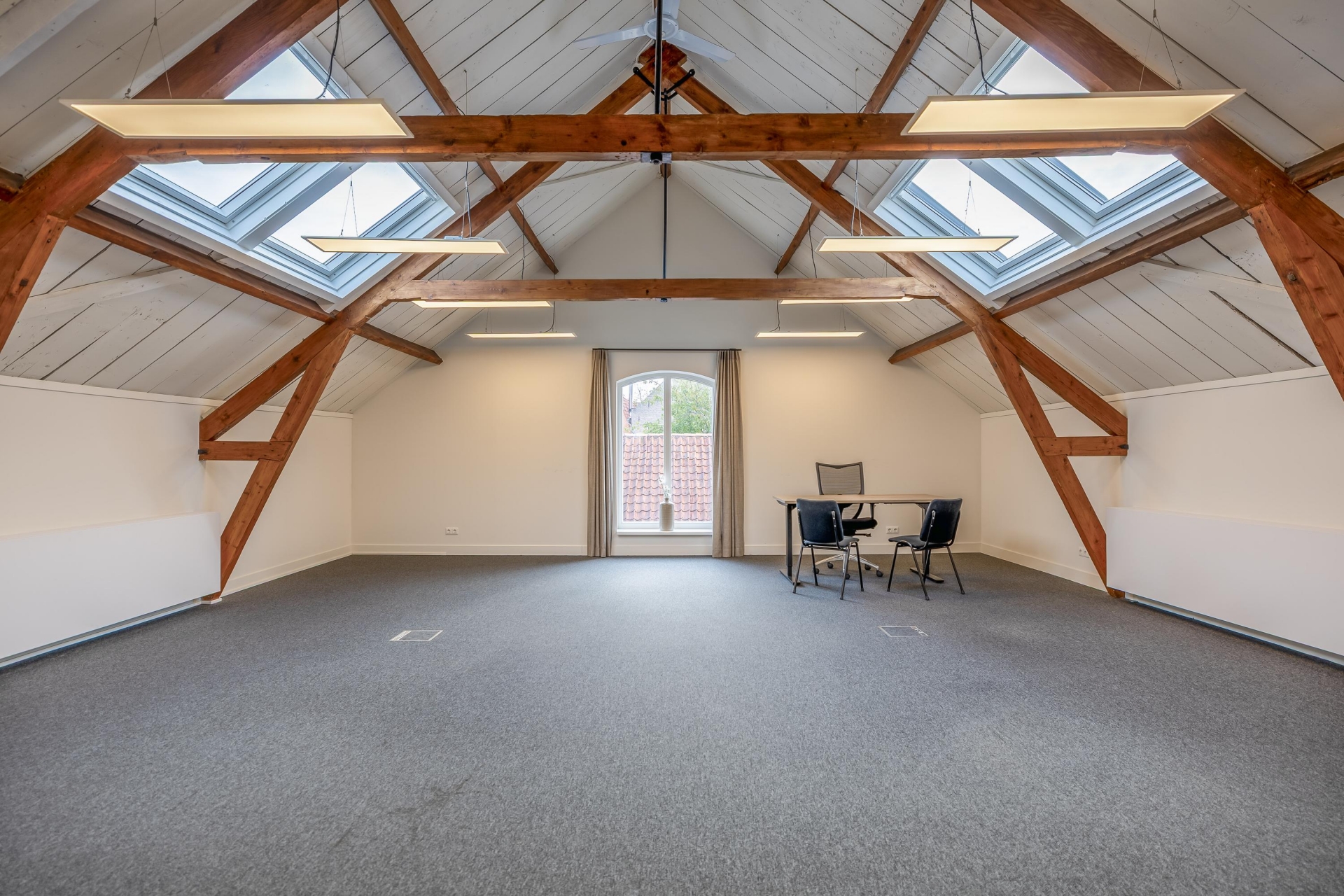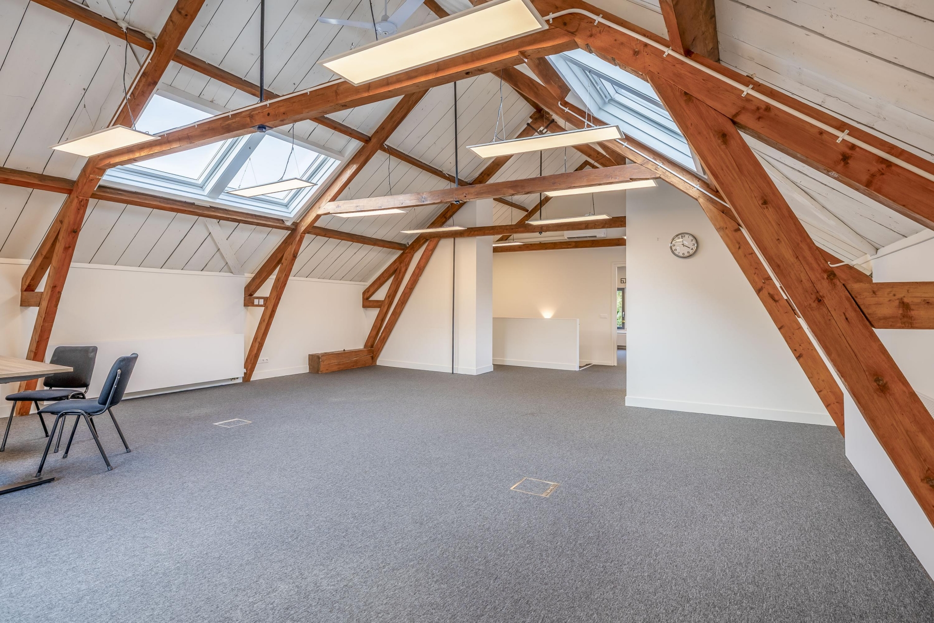 Vanuit de overloop loop je naar twee aparte kantoorruimtes: aan de linkerzijde bevindt zich een afsluitbare kamer van circa 37 m², ideaal als vergaderruimte of zelfstandig kantoor. Aan de rechterzijde ligt een royale open werkruimte van ongeveer 62 m², met een hoge nok, fraaie zichtbare balken en volop daglicht dankzij de dakramen en hoge raampartijen.