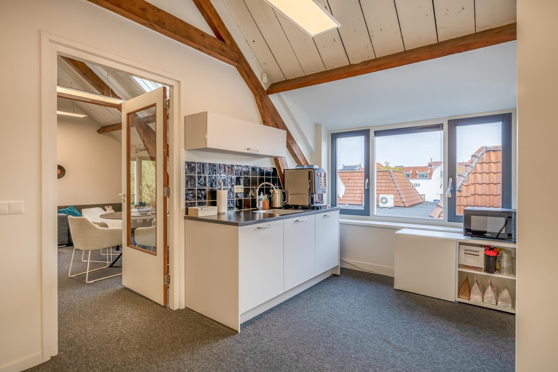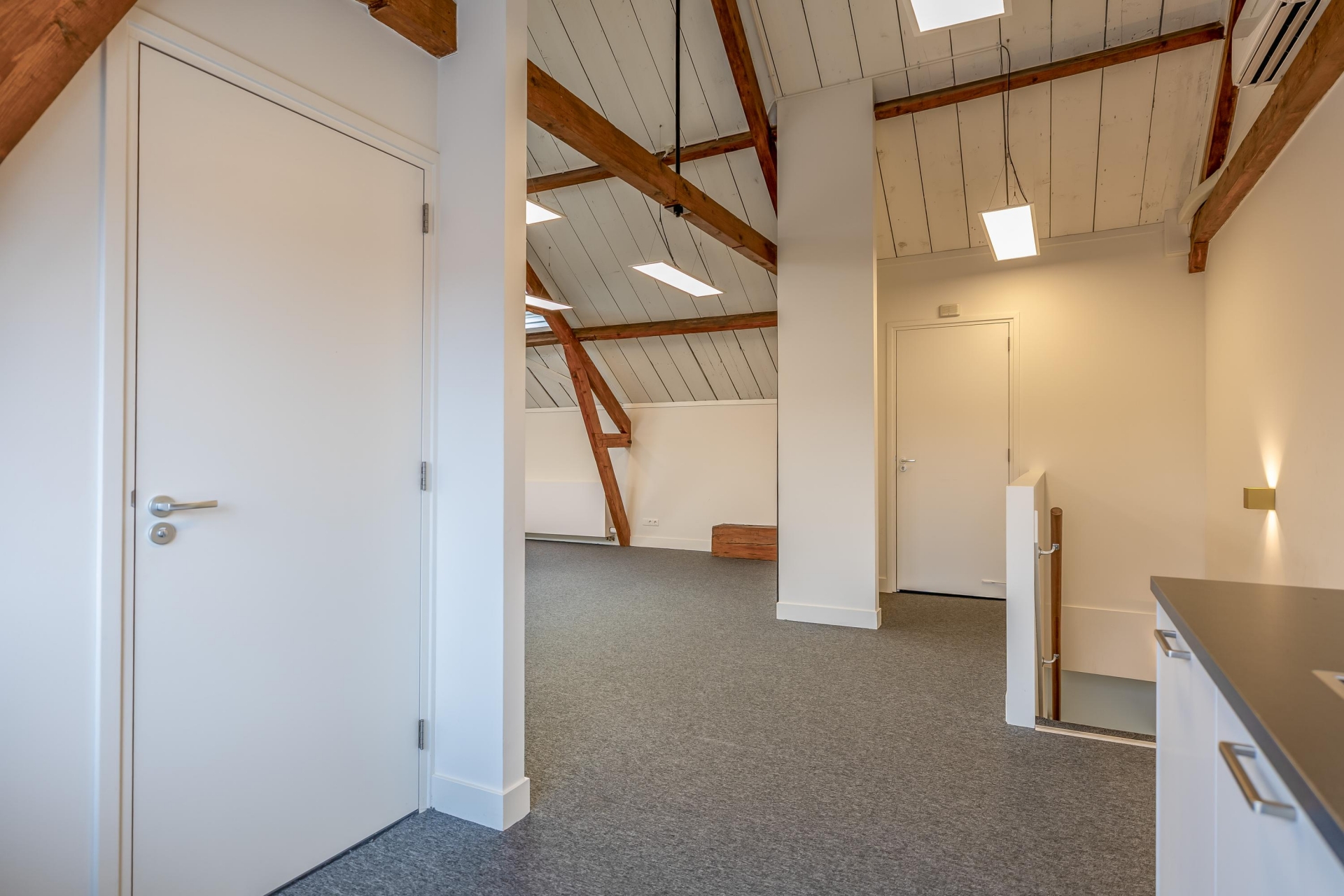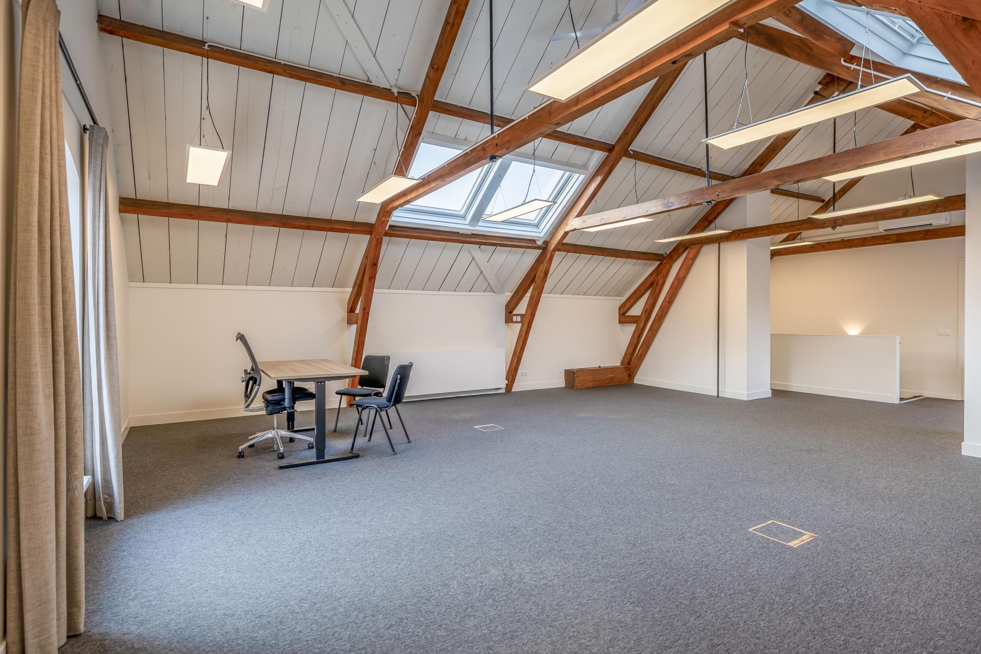 De open ruimtes onder de zichtbare houten balken zorgen voor een prettige sfeer en veel daglicht. Ideaal voor creatieve bureaus, advieskantoren of kleinschalige dienstverleners die waarde hechten aan uitstraling en comfort.