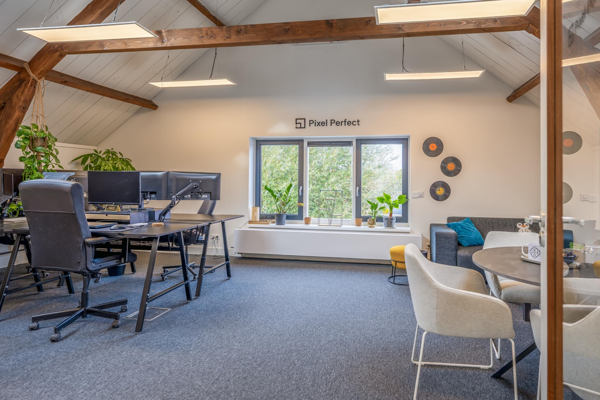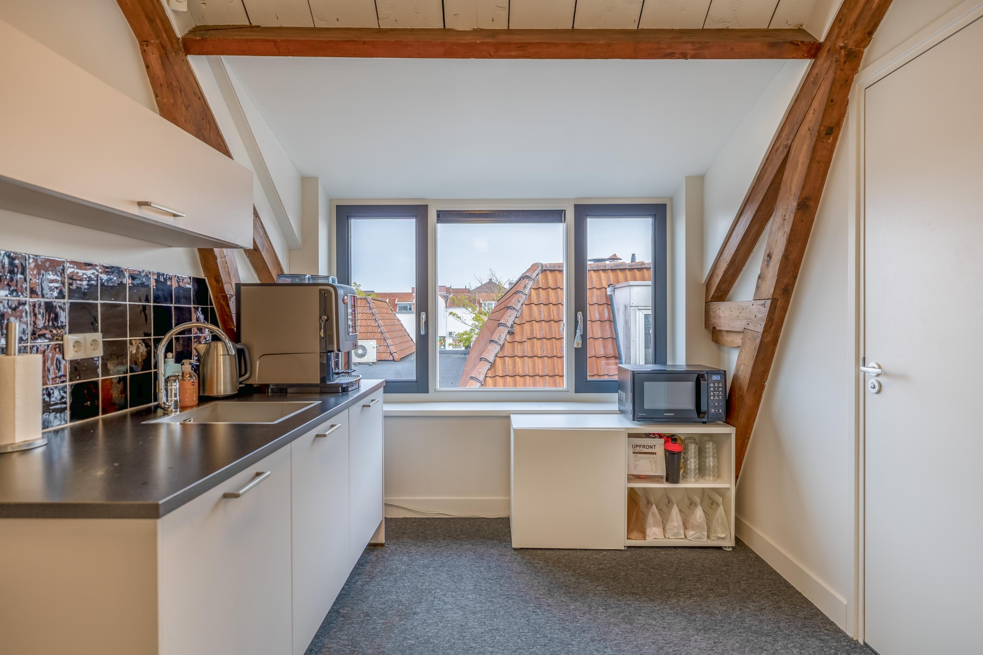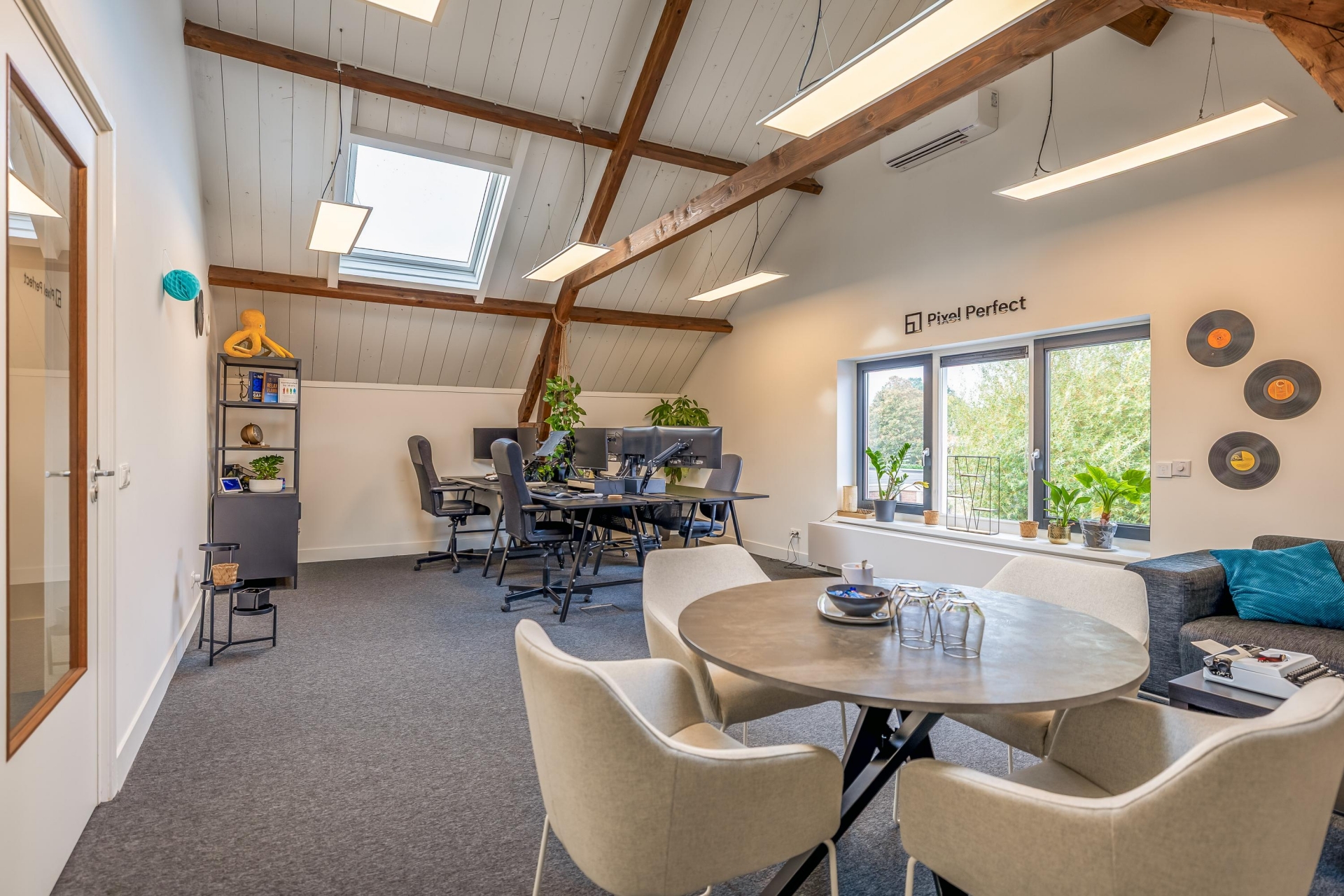De open ruimtes onder de zichtbare houten balken zorgen voor een prettige sfeer en veel daglicht. Ideaal voor creatieve bureaus, advieskantoren of kleinschalige dienstverleners die waarde hechten aan uitstraling en comfort.