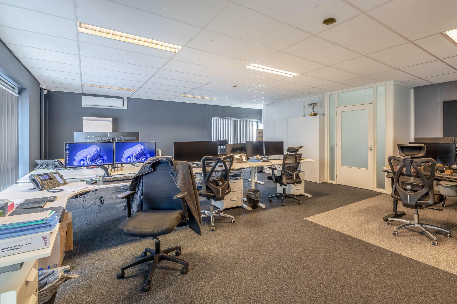 Kantoorruimte van circa 80 m², ook deze ruimte is vrij indeelbaar, systeemplafond met inbouwarmaturen, mechanische ventilatie en cv-ruimte.